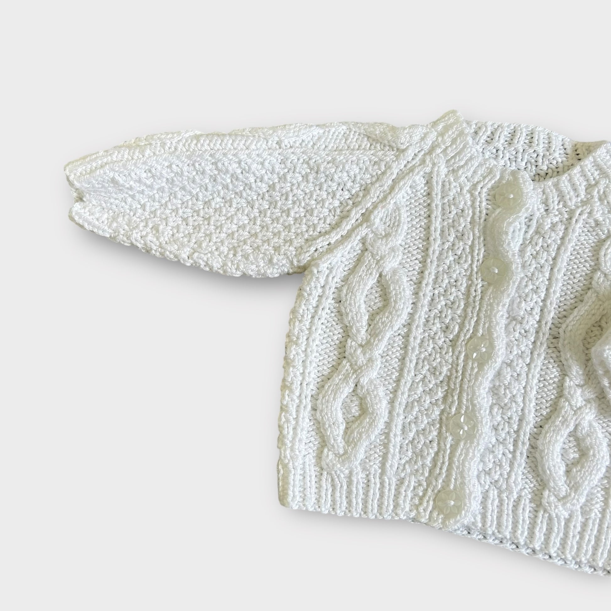A beautifully hand knitted white chunky cable knit cardigan. In excellent used condition, a perfect staple piece for any little ones wardrobe!