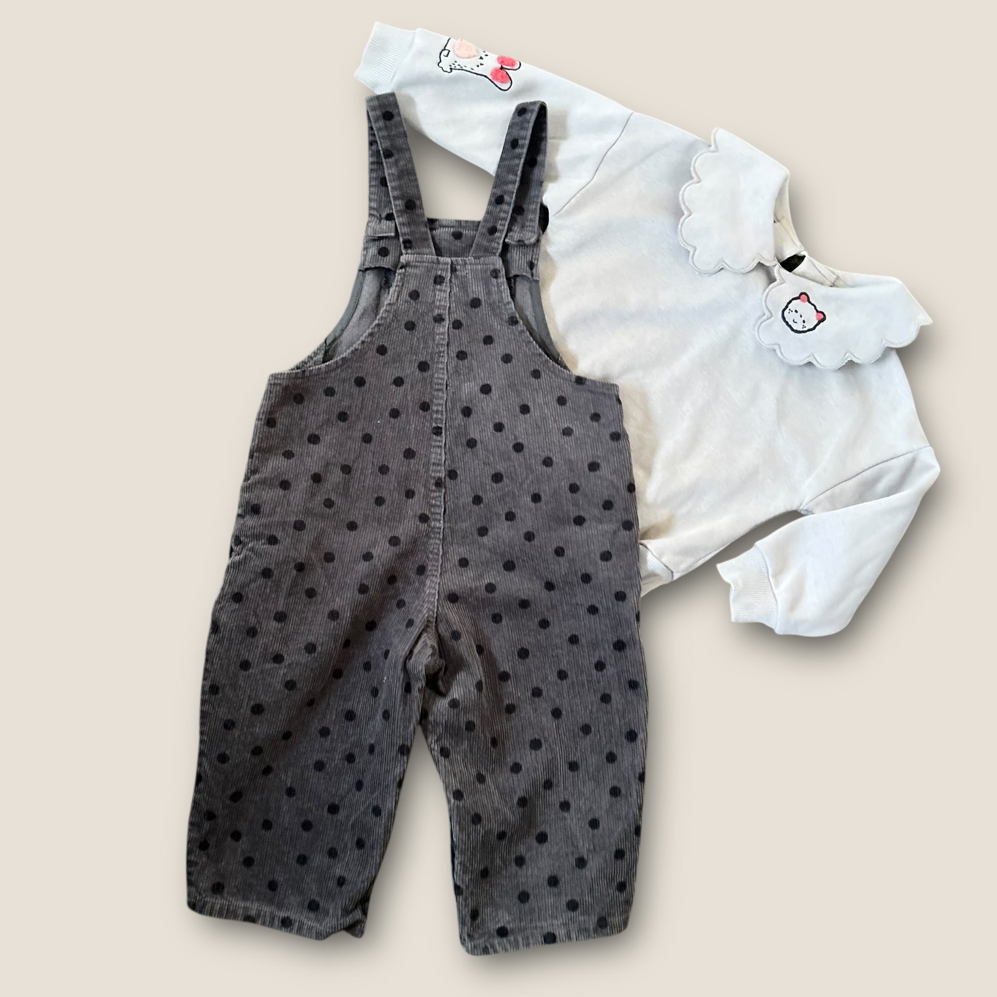 A beautiful corduroy dungaree outfit set in polka dot print and sweatshirt with cat and bunny embroidery on collar and sleeve. Has popper buttons down the legs for easy nappy changes and adjustable button straps on the waist and shoulders.