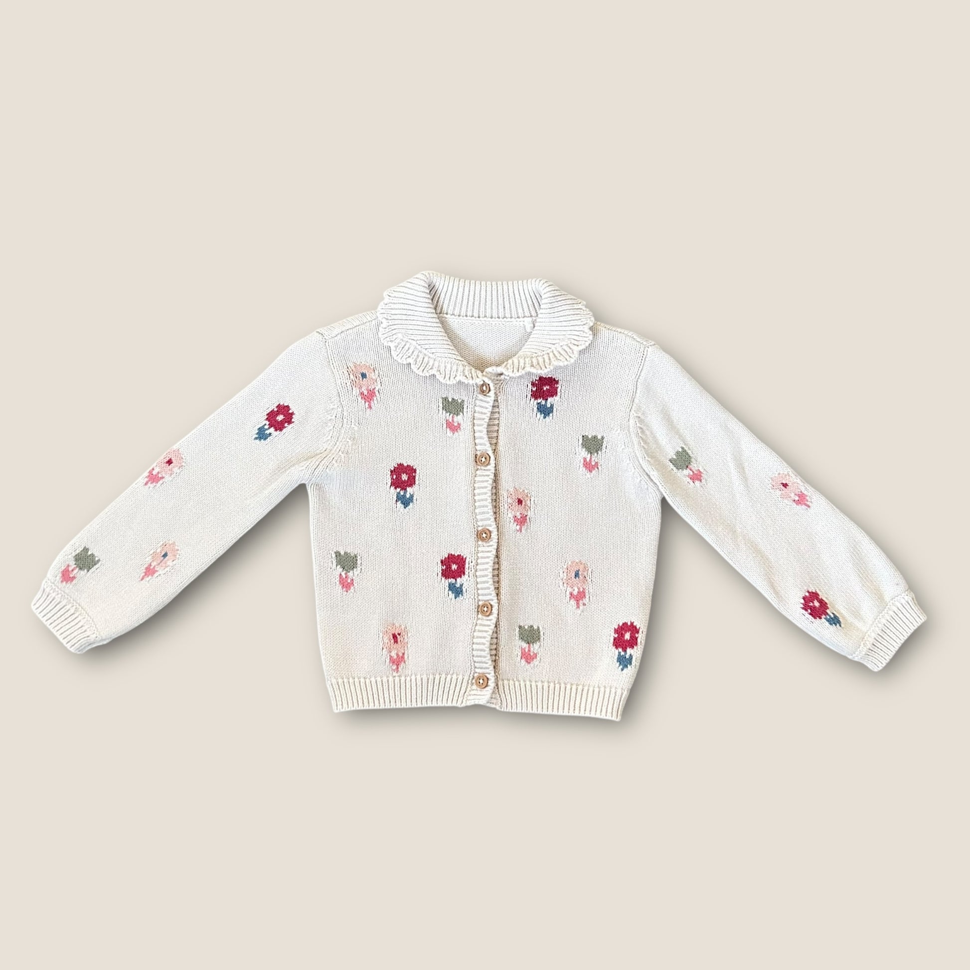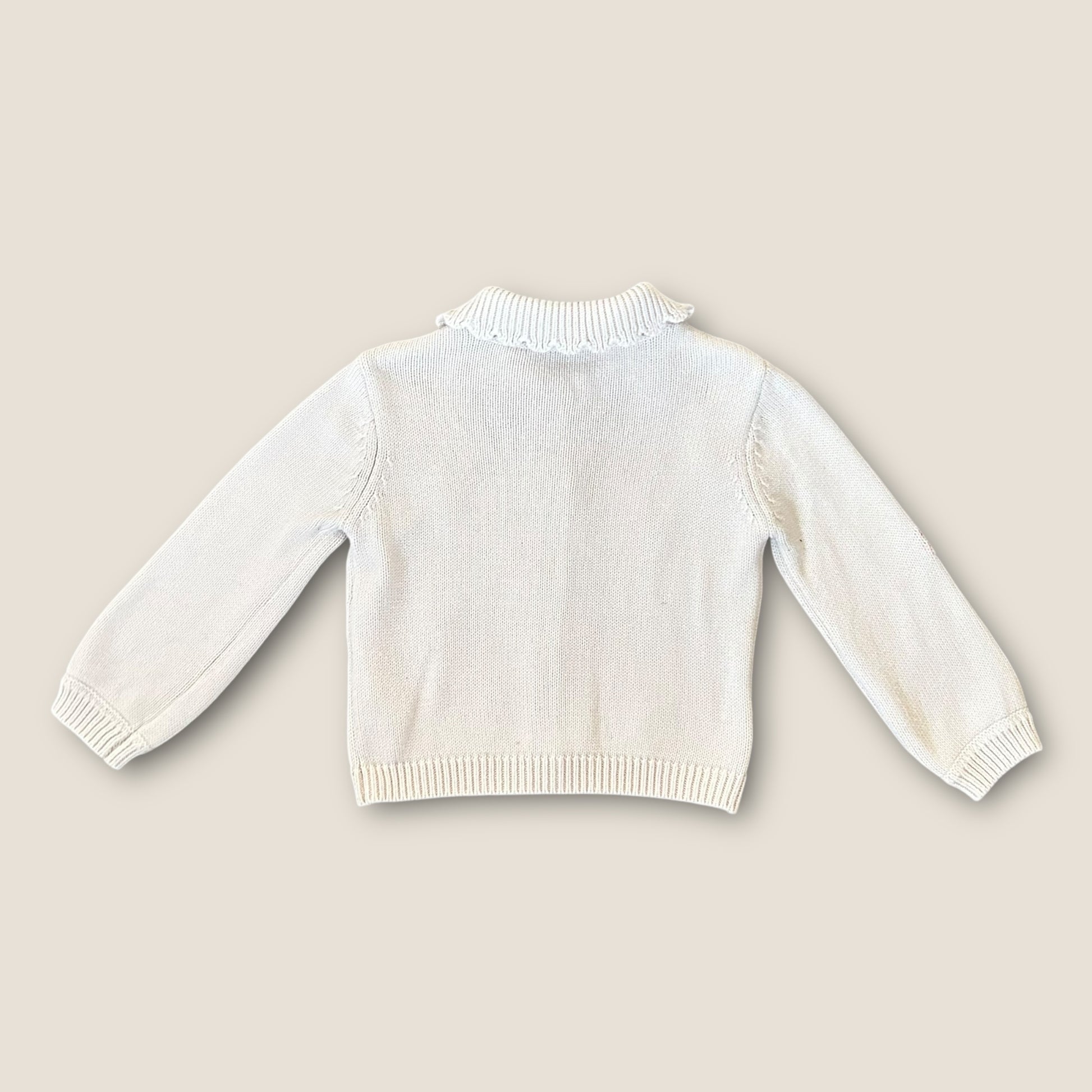 A gorgeous little knitted cardigan in cream with embroidered florals and ribbed collar detail.
