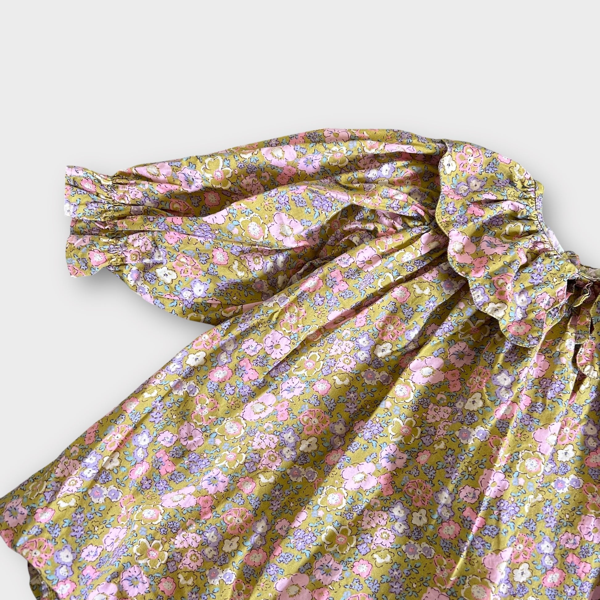 A beautiful olive green and pink floral long sleeved dress with gorgeous scalloped oversized collar detail! In perfect condition, no signs of wear at all and makes the best party/occasion dress.