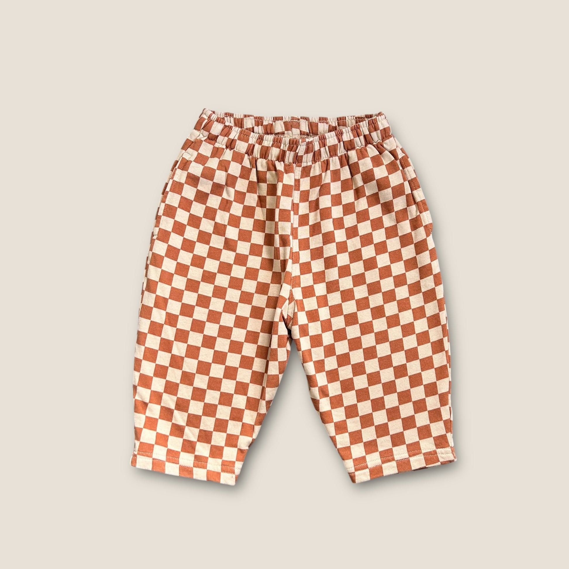 A super cool pair of checkerboard trousers in orange and beige. Balloon/wide fit sweatshirt fabric with drawstring waist. These could be unisex, pair them up with a baggy sweatshirt!