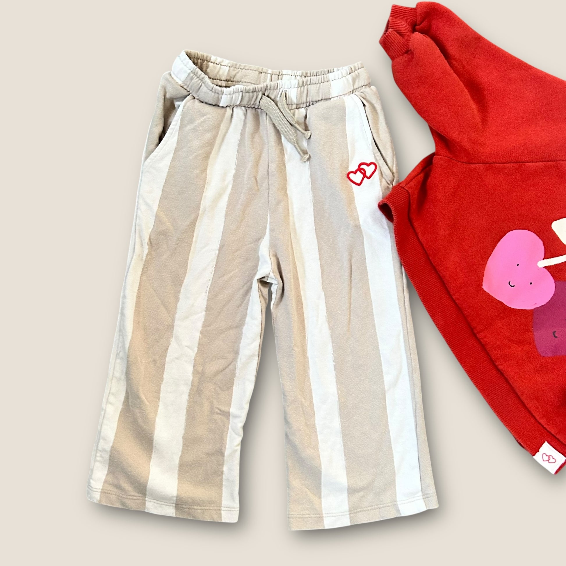 A gorgeous little outfit set including striped beige wide leg trousers and a vibrant red sweatshirt in a boxy fit with cherry hearts print graphic.