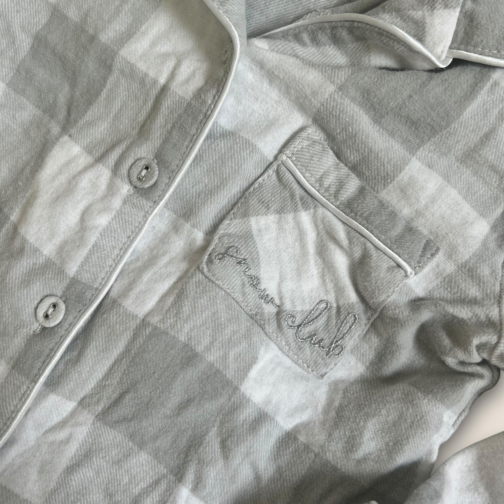 A lovely pair of grey and white checkered button up pyjamas in soft flannel shirt fabric. With embroidered 'snow club' on the pocket.