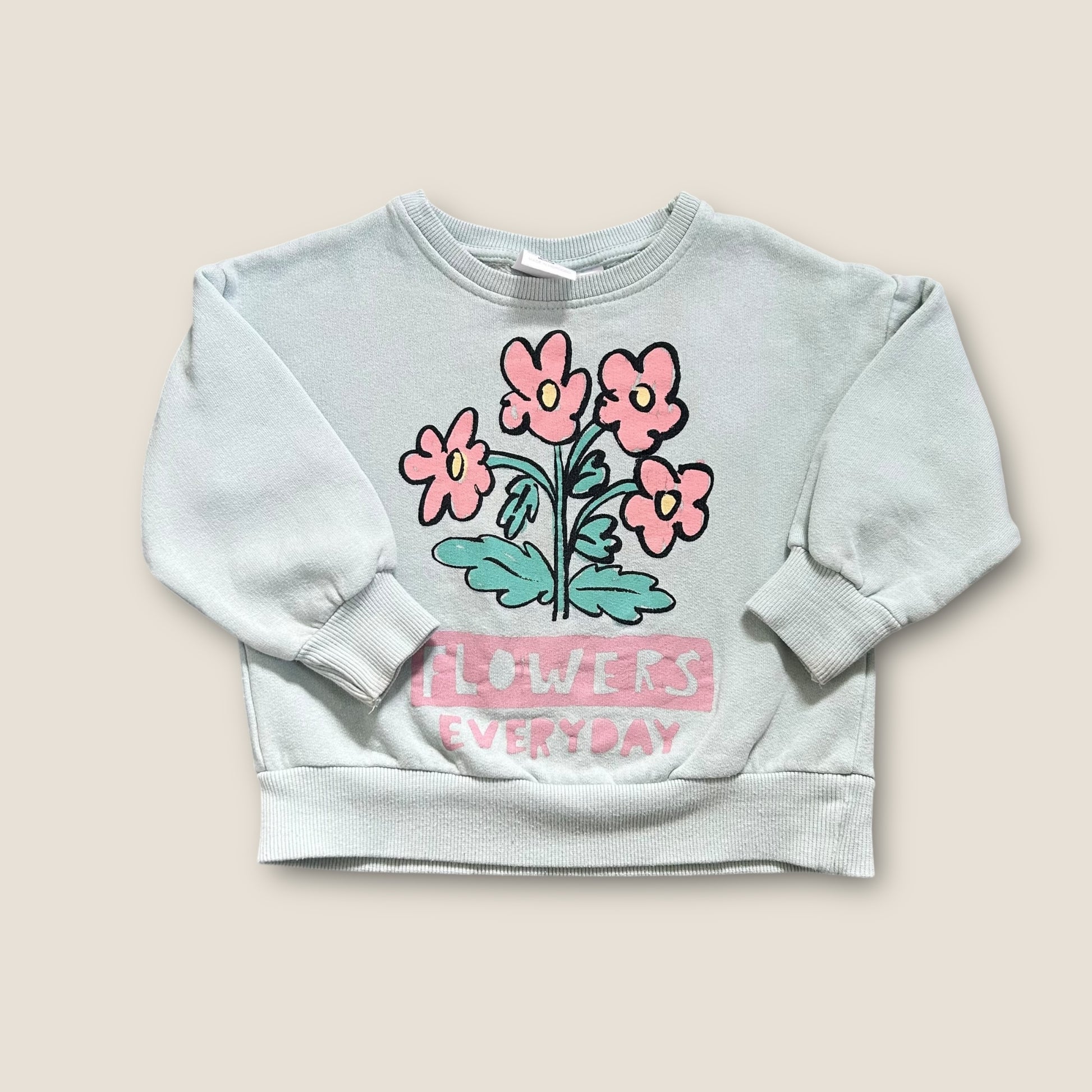 A lovely little light blue sweatshirt with floral graphic print across 'flowers everyday' slogan.