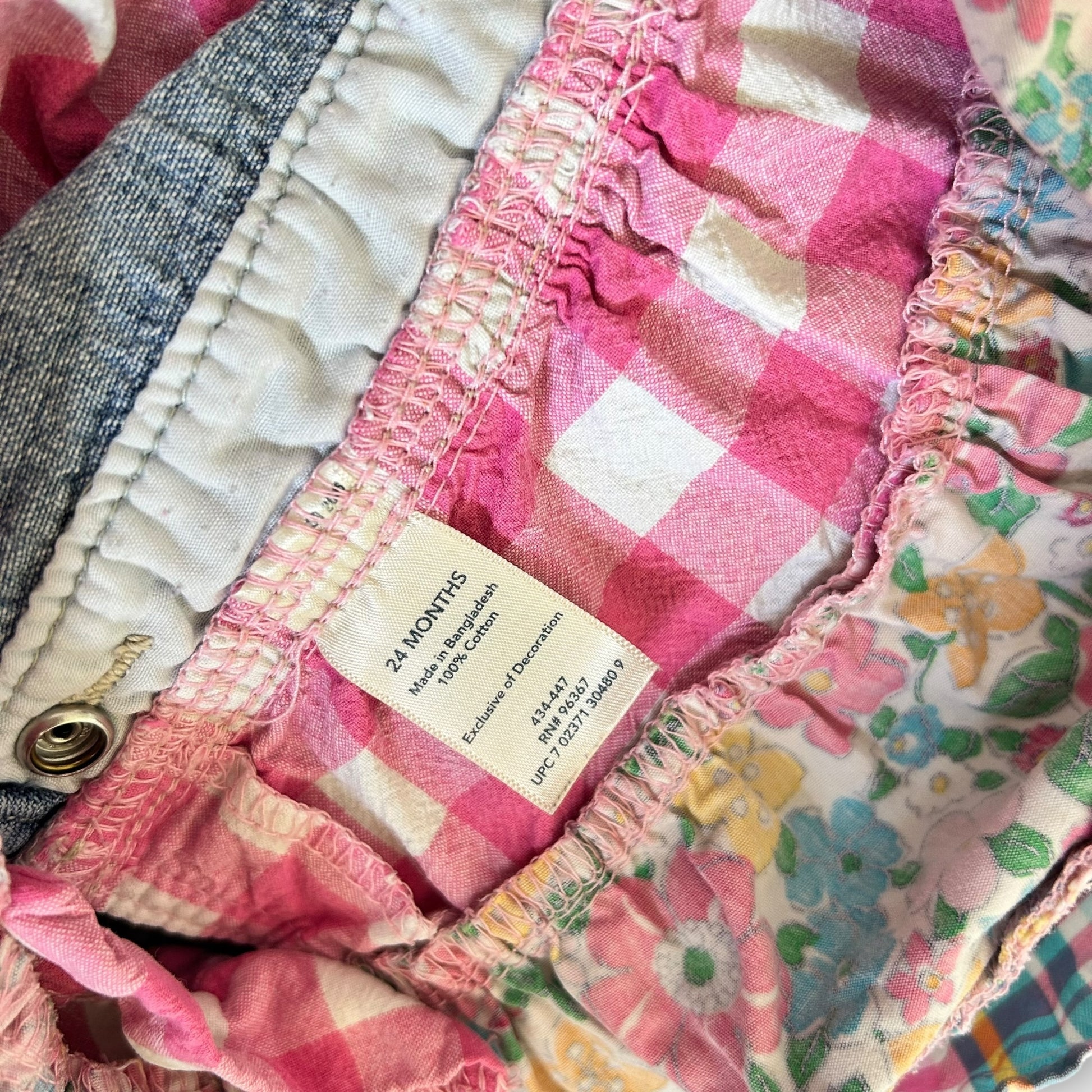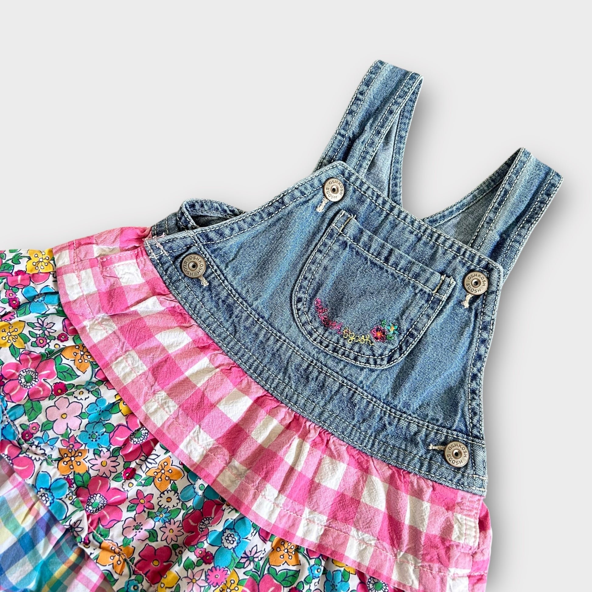 A gorgeous vintage style tiered pink checkered gingham floral denim dress in a popper dungaree style.