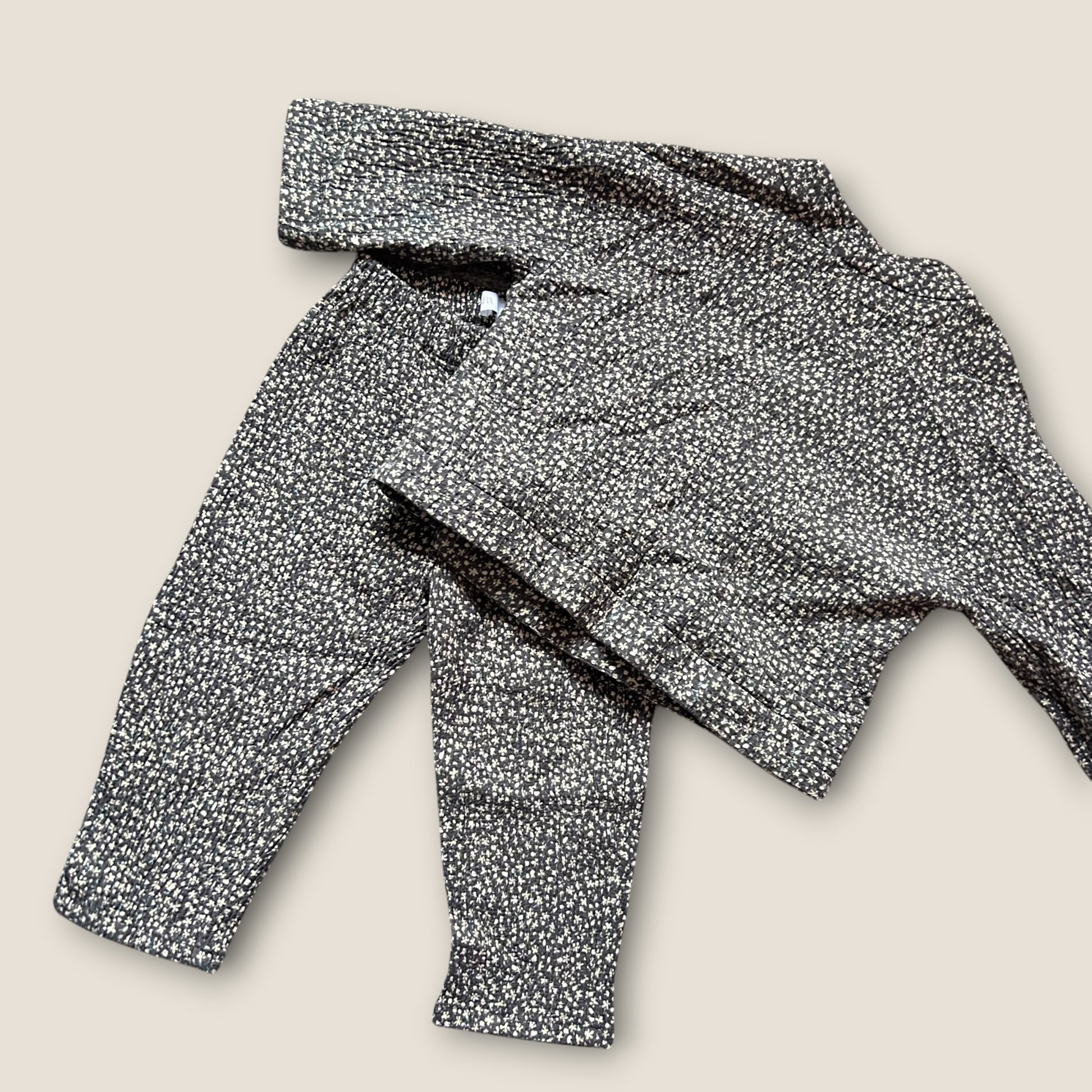 The 18-24 Months Zara Navy Blue Floral Co-ord Kimono Jacket and Trousers Set features a coordinated kimono jacket and trousers, designed for comfort and ease of movement for active toddlers. The floral pattern adds visual appeal, while the breathable fabric ensures suitability for various temperatures, promoting a pleasant wearing experience.