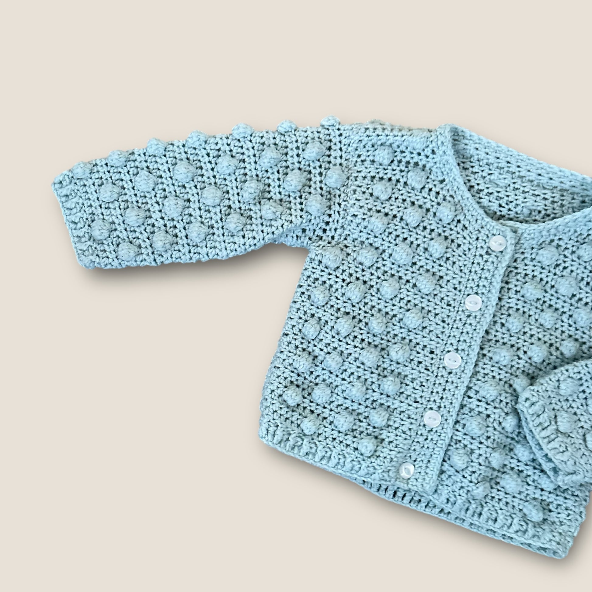 A gorgeous light blue pom pom style hand knitted cardigan.