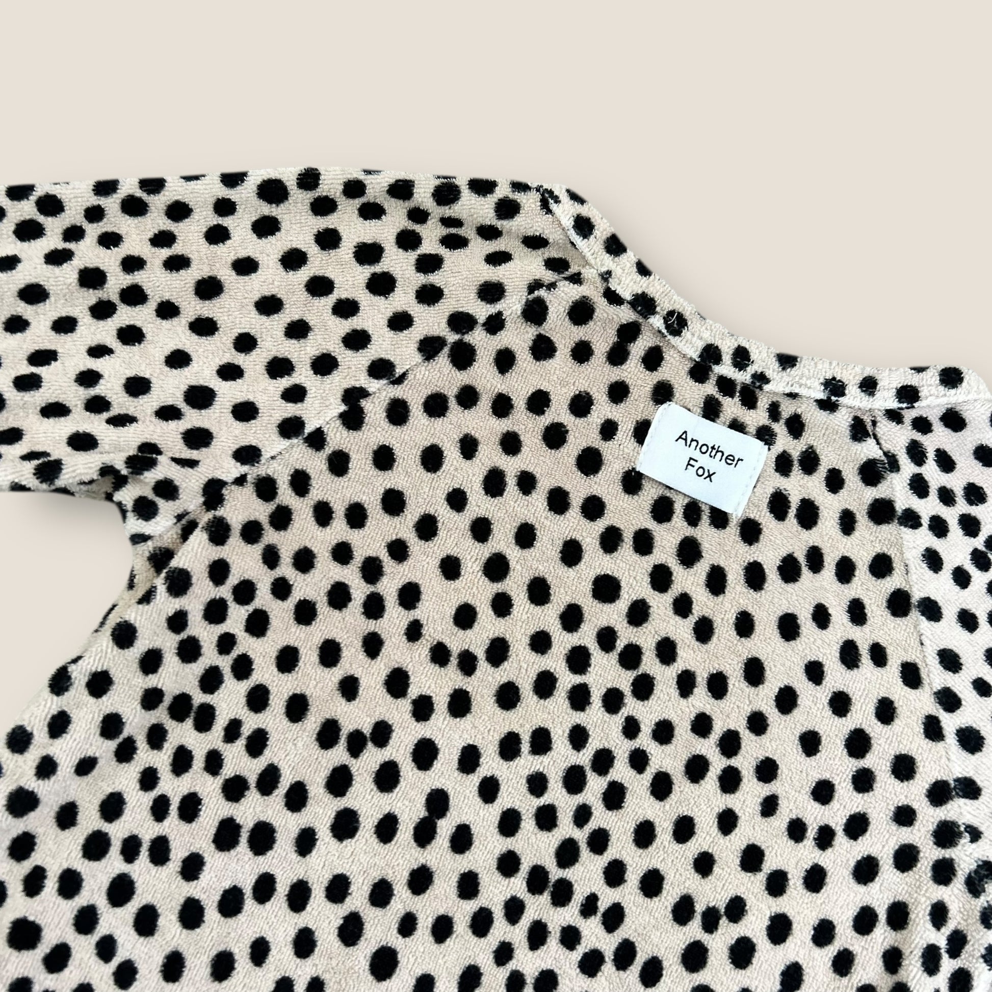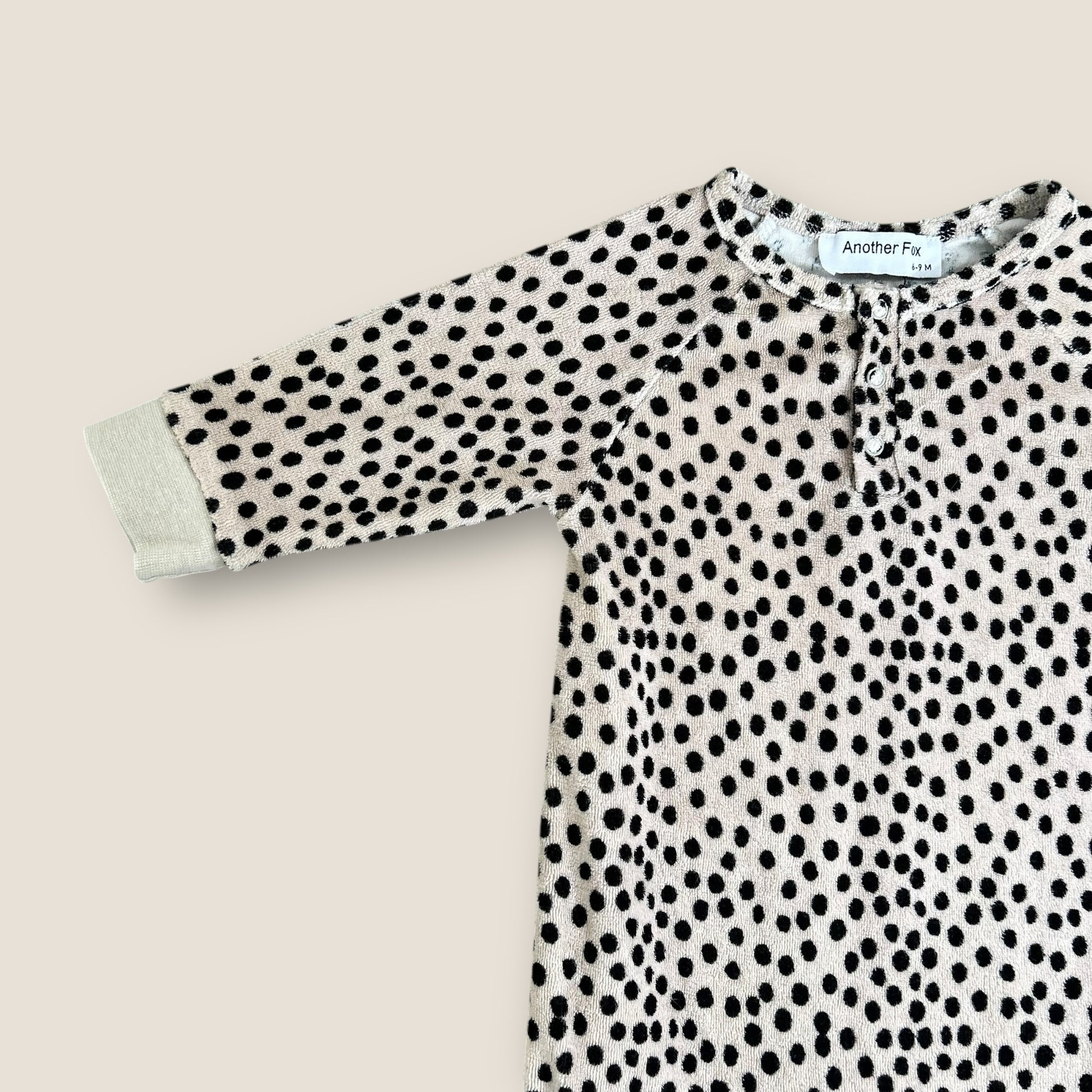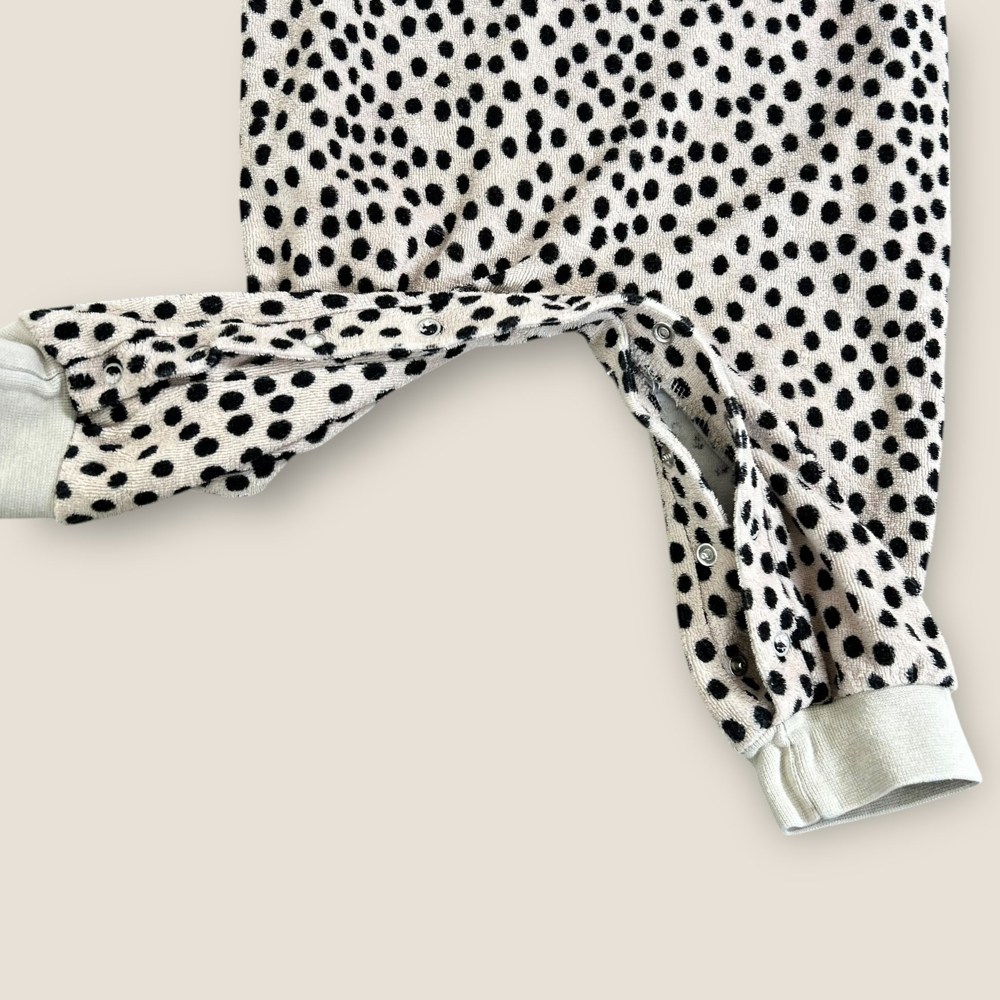 A beautiful unisex polka dot beige and black terry towel romper sleepsuit. Footless but has popper buttons across the legs for easy nappy changes.