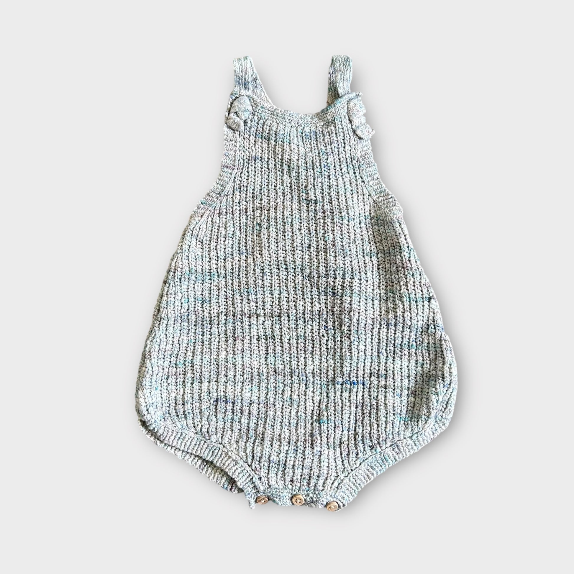 A beautiful little knitted romper in a light blue marl colour, With adjustable straps and buttons on the bottom for easy nappy changes. This little romper is perfect for all year round! In excellent used condition with plenty of wear left in it!