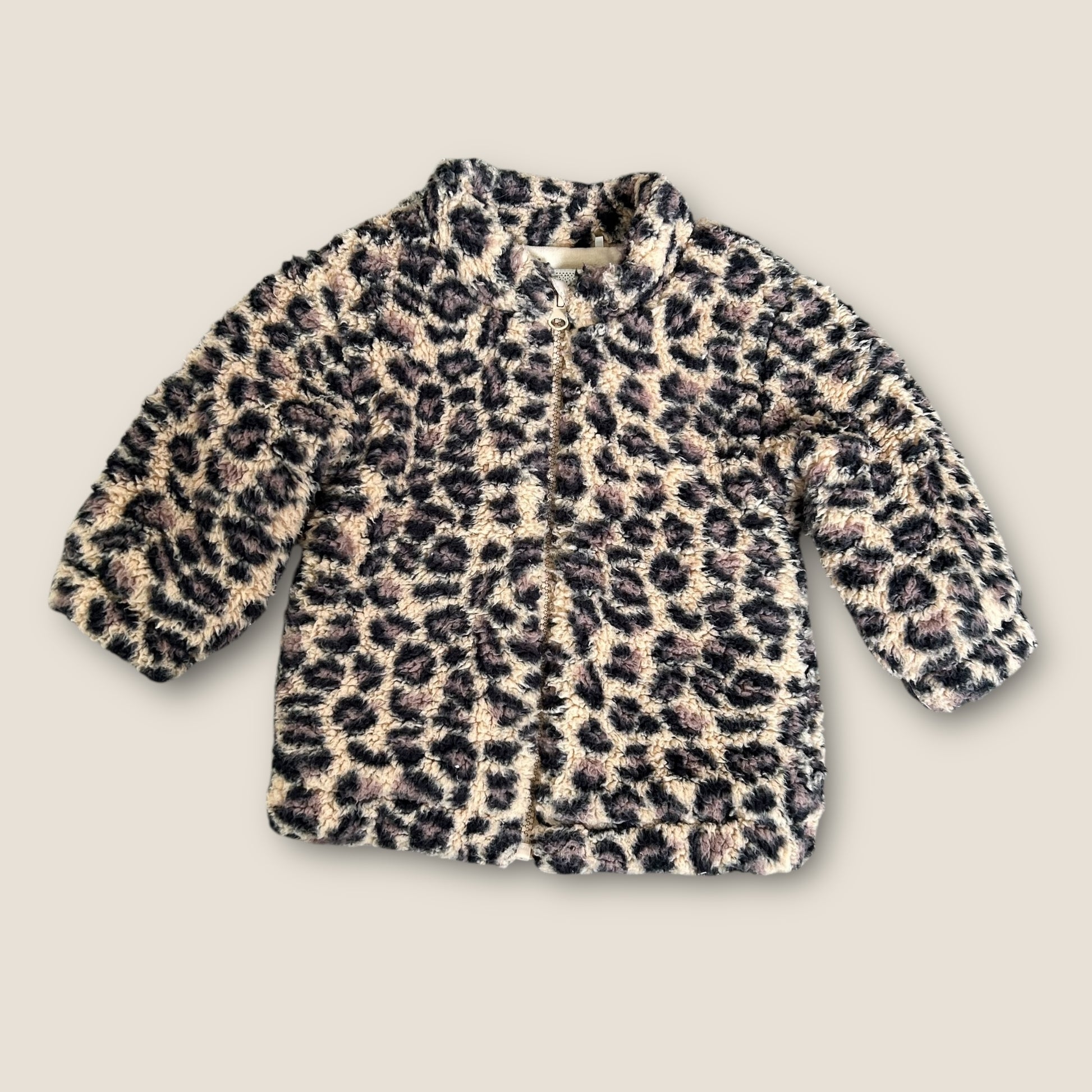 A lovely little cosy fleece jacket in beige/brown leopard print. Zip fastening, in great condition. some signs of bobbling here and there but nothing major at all.