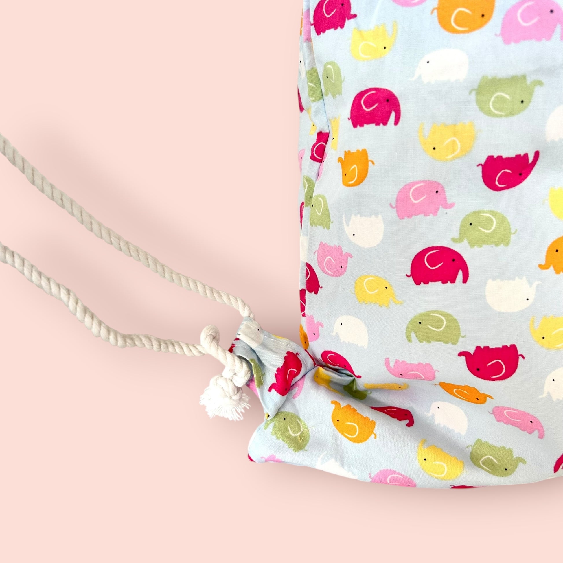 A gorgeous handmade drawstring bag made from a luxury soft 100% cotton fabric. Printed with super cute and quirky elephants.